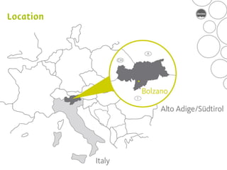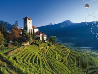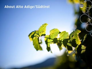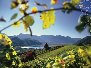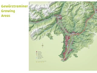 The document provides an overview of the history and wine production of the Alto Adige region in northern Italy, noting key dates such as it becoming an autonomous region in 1972 and the recognition of the Alto Adige appellation in 1975. It details the climate, soil conditions, and grape varieties grown in the region such as Pinot Grigio, Sauvignon Blanc, Gewürztraminer, Schiava, and Lagrein. Production facts are given such as the 13,100 vineyard acres planted, 98% being DOC/DOP designated, and 40 million bottles produced annually accounting for 0.7% of Italy's total wine production.