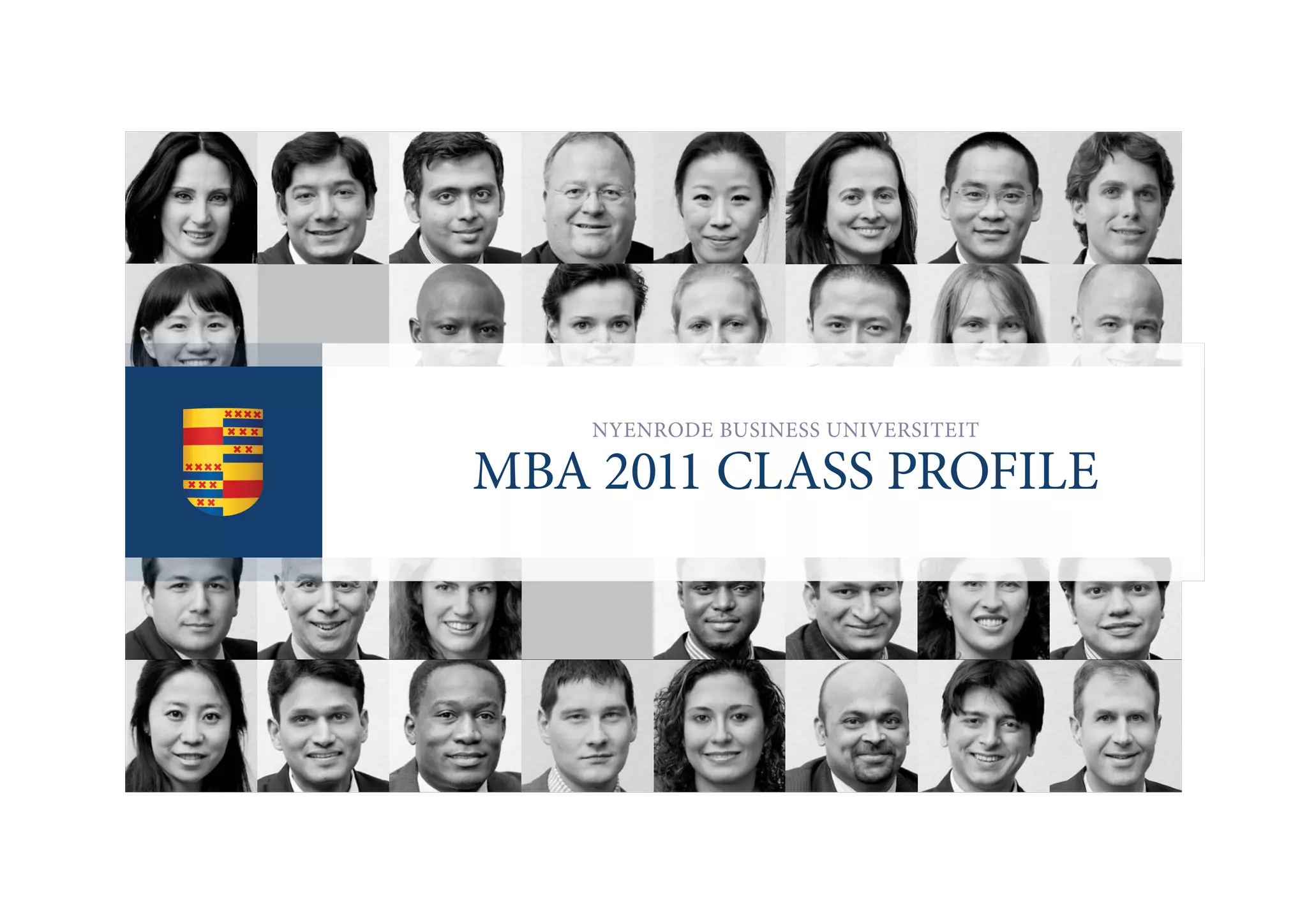 The document presents the MBA class profile of Nyenrode Business Universiteit for 2011, highlighting a diverse group of candidates from nineteen nationalities, equipped with various skills and experiences. It emphasizes the importance of selecting talented individuals who can bring value and innovative solutions to organizations. The profiles include details about each candidate's education, work experience, and unique attributes, showcasing their readiness to contribute to the business world.