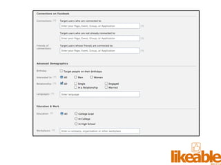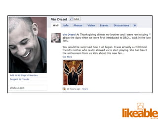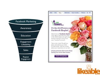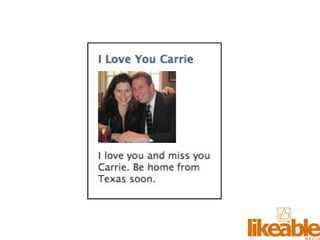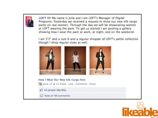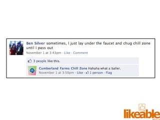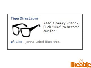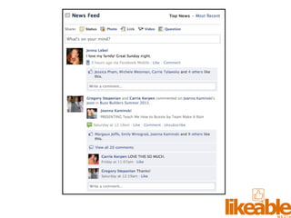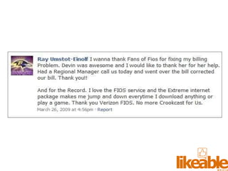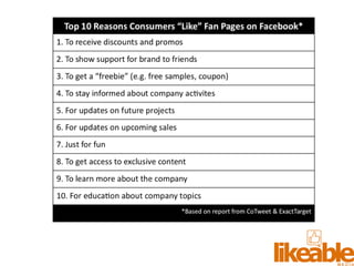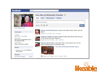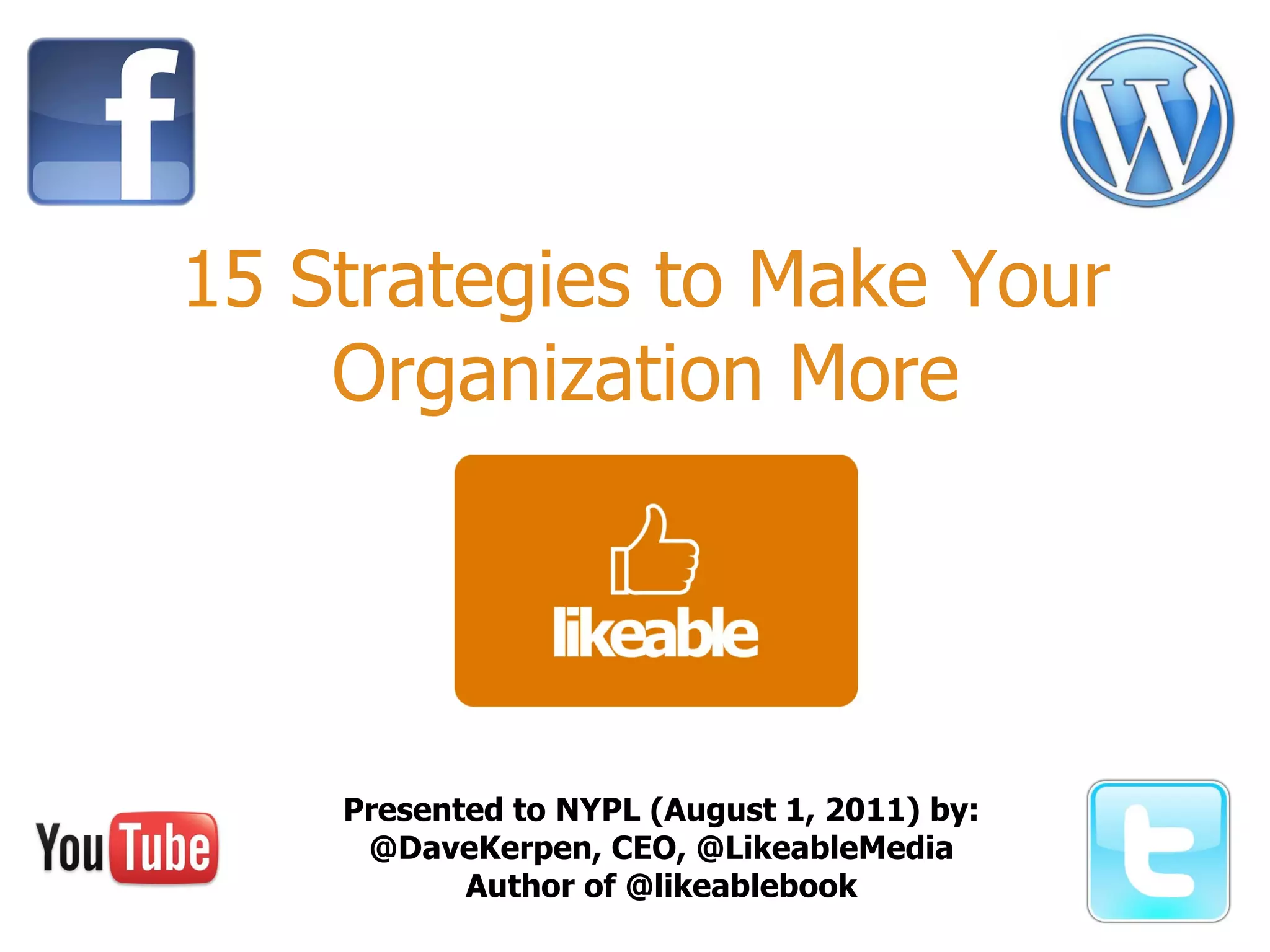 The document outlines 15 strategies for making an organization more social media-savvy and likeable. The strategies include listening to customers, thinking like customers, compelling customers to be fans, responding quickly to comments both good and bad, being authentic, providing value for free, sharing stories, inspiring customer story sharing, integrating social media into the customer experience, using Facebook ads effectively, admitting and learning from mistakes, consistently delivering excitement and surprises, and focusing on making it easy for customers to buy rather than directly selling to them. The overall message is to listen to customers, be transparent, respond to all feedback, and just strive to be likeable on social media.