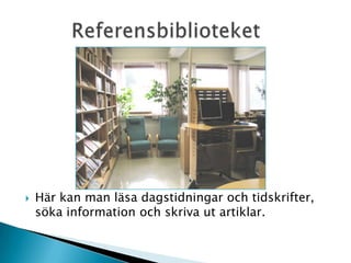 Här kan manläsa dagstidningar och tidskrifter, söka information och skriva ut artiklar. Referensbiblioteket - 3.