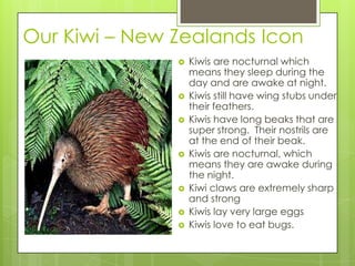 This document provides information about several native New Zealand bird species: the kiwi, kea, pukeko, kereu, tui, hoiho, whio, and kakapo. For each bird, the document outlines key physical characteristics and behaviors, and includes videos that showcase the birds' vocalizations. It also shares details about conservation efforts for some of the endangered species.