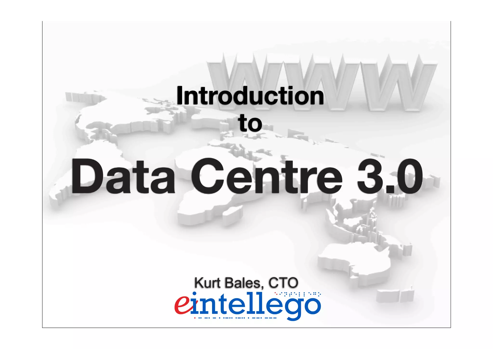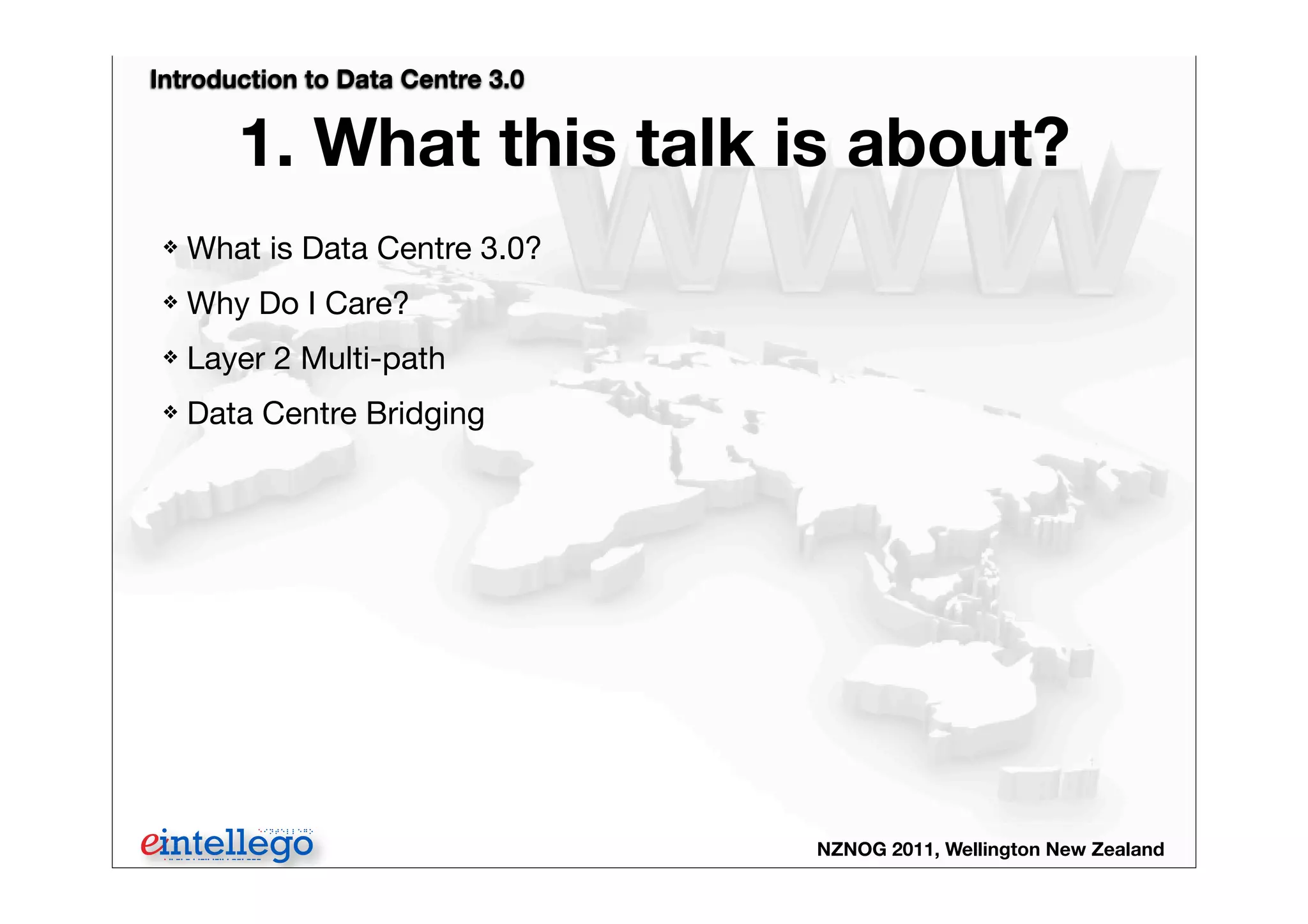 The presentation by Kurt Bales at NZNOG 2011 introduces Data Centre 3.0, focusing on advancements in network architecture such as Layer 2 multi-pathing and Data Centre Bridging. It discusses the transition from traditional 3-tier designs to more converged and virtualized infrastructures, emphasizing the importance of these changes for engineers and their customers. Additionally, it highlights key protocols and standards that support enhanced data transmission and Quality of Service in modern data centres.
