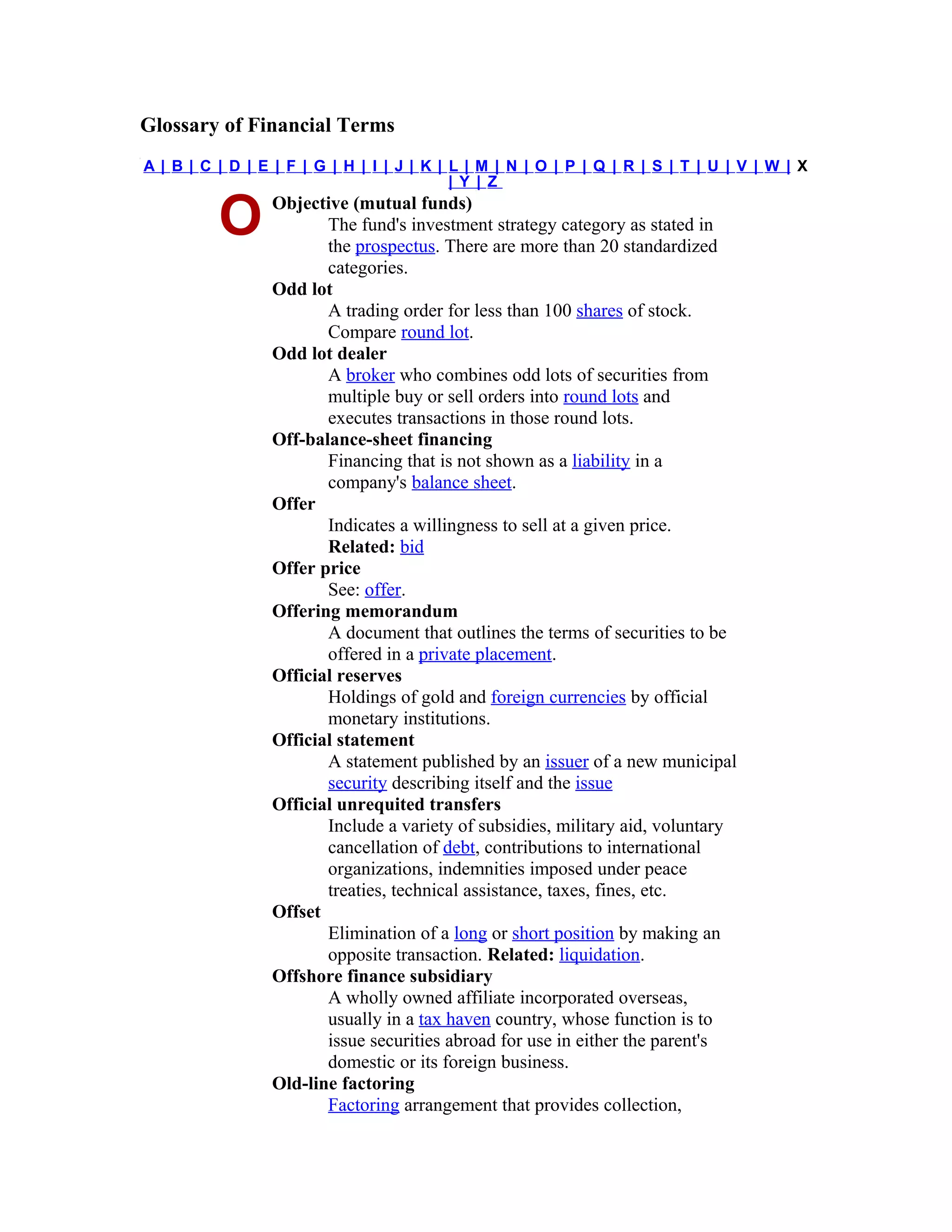 This document defines financial terms from A to O. It provides definitions for terms like objective (mutual funds), odd lot, odd lot dealer, off-balance-sheet financing, offering memorandum, official reserves, and more. The definitions are concise explanations of what each term means within the context of finance.