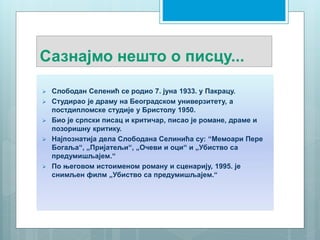 Најпознатија дела Слободана Селинића су: “Мемоари Пере