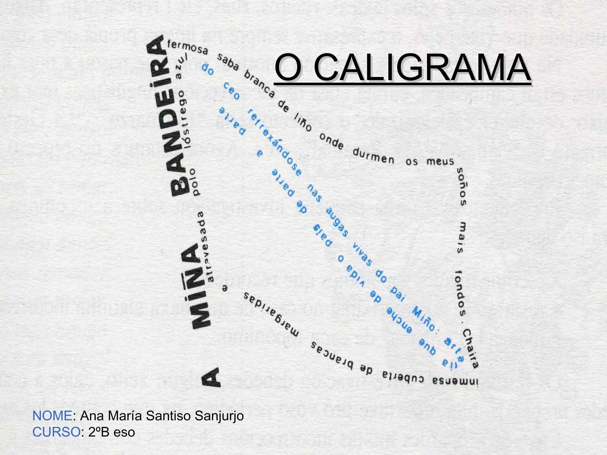 O caligrama éun poema, frase ou palabra cuxo propósito é formar unha figura acerca