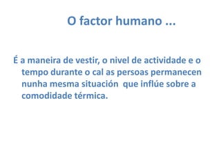 O factor humano...É a maneira de vestir, o nivel de actividade e o tempo durante o cal as persoas permanecen nunhamesma situación que inflúe sobre a comodidade térmica.