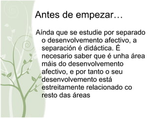 Antes de empezar…Aínda que se estudie por separado o desenvolvemento afectivo, a separación é didáctica. É necesario saber que é unha área máis do desenvolvemento afectivo, e por tanto o seu desenvolvemento está estreitamente relacionado co resto das áreas