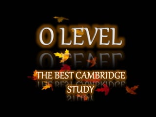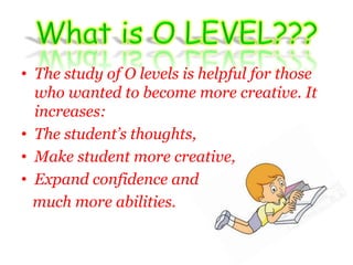 O Levels help students become more creative by expanding their thoughts and abilities. It increases student confidence and makes them more responsible through stopping cramming. The syllabus covers various subjects like English, mathematics, science, history, geography, computer science, and Islamiyat. Students develop important skills like communication, problem solving, historical analysis, and understanding of religious beliefs. Overall, O Levels build students' knowledge and creativity in many areas which helps them achieve their goals.