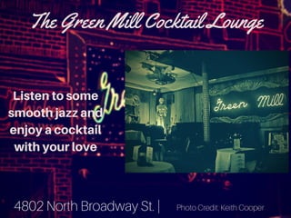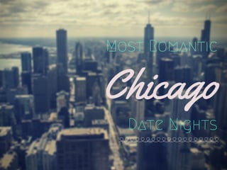 This document provides suggestions for romantic date night activities in Chicago, including visiting The Green Mill Cocktail Lounge for jazz and drinks, exploring art exhibits at the Art Institute of Chicago, enjoying Italian cuisine at Italian Village restaurants, taking in a performance at the Chicago Symphony Night or Chicago Theatre, and catching the skyline views from the rooftop bar at the Wit hotel. It also lists contact information for a transportation service for getting around the city.