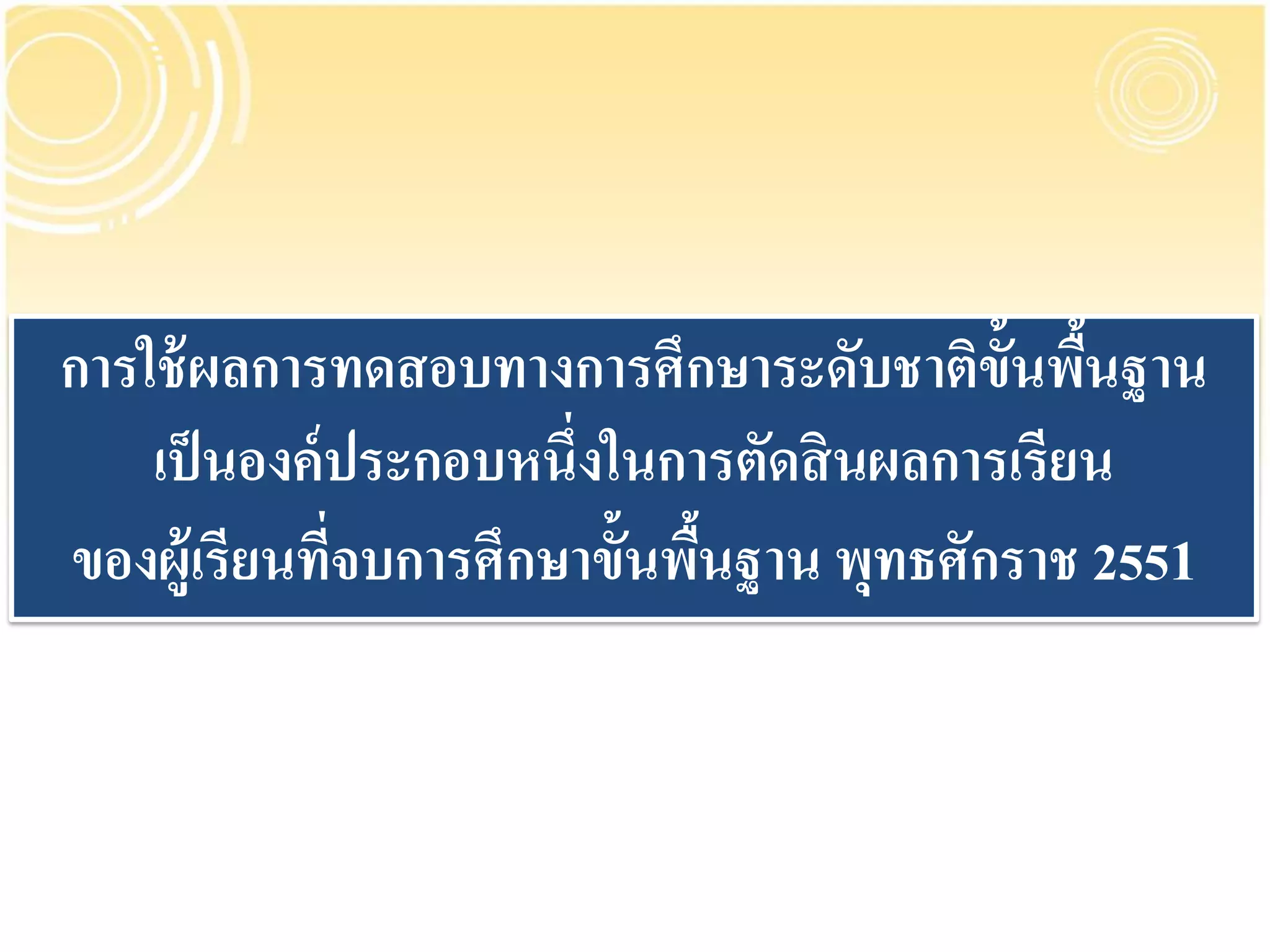 ผู้ เ รี ย นที่ จ บการศึ ก ษา ตามหลั ก สู ต รแกนกลางการศึ ก ษา ขั้นพืนฐาน พุทธศักราช 2551 ของระดับประถมศึกษา และระดับ ้ มั ธ ยมศึ ก ษา ต้ อ งมี ผ ลการทดสอบทางการศึ ก ษาระดั บ ชาติ ขั้นพืนฐาน (O-NET) โดยใช้ ผลการเรี ยนของผู้เรี ยนที่ประเมิน ้ โดยสถานศึ ก ษา และผลการทดสอบทางการศึ ก ษาระดั บ ชาติ ขั้นพืนฐาน (O-NET) ในสั ดส่ วน 80 : 20 ตั้งแต่ ปีการศึกษา 2555 ้ เป็ นต้ นไป