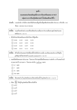 แบบปรนัย 4 ตัวเลือก แต่ละข้อมีคำตอบที่ถูกต้องที่สุดเพียงคำตอบเดียว จำนวน 45 ข้อ (ข้อ 1-45) ข้อละ 1 คะแนน รวม 45 คะแนน ตัวชี้วัด ระบุหรือยกตัวอย่ำง และเปรียบเทียบจำนวนเต็มบวก จำนวนเต็มลบ ศูนย์เศษส่วนและ ทศนิยม (ค 1.1 ม.1/1) 1. ข้อใดเรียงลำดับทศนิยมจำกน้อยไปมำกได้ถูกต้อง 1 0.044 0.242 0.444 0.424 2 0.258 0.825 0.852 0.528 3 0.245 0.425 0.457 0.542 4 0.001 0.011 0.111 0.101 ตัวชี้วัด เข้ำใจเกี่ยวกับเลขยกกำลังที่มีเลขชี้กำลังเป็นจำนวนเต็ม และเขียนแสดงจำนวนให้อยู่ใน รูปสัญกรณ์วิทยำศำสตร์ (scientific notation) (ค 1.1 ม.1/2) 2. เซลล์เม็ดเลือดแดงยำวประมำณ 7 ไมครอน ถ้ำนำเซลล์เม็ดเลือดแดงมำวำงต่อกัน 10 ล้ำนเซลล์ จะมี ควำมยำวเท่ำไร (ควำมยำว 1 ไมครอน เท่ำกับ เมตร) 1 0.7 เมตร 2 7 เมตร 3 70 เมตร 4 700 เมตร ตัวชี้วัด เขียนเศษส่วนในรูปทศนิยมและเขียนทศนิยมซ้ำในรูปเศษส่วน (ค 1.1 ม.2/1) 3. เขียน ให้อยู่ในรูปทศนิยมได้ตรงกับข้อใด 1 0.453 2 0.453 3 0.457 4 0.457 ชุดที่ 1 1 1,000,000 453 990 . . .. .. .. แบบทดสอบวัดผลสัมฤทธิ์ทางการเรียนเตรียมสอบ O-NET กลุ่มสาระการเรียนรู้คณิตศาสตร์ ชั้นมัธยมศึกษาปีที่ 3