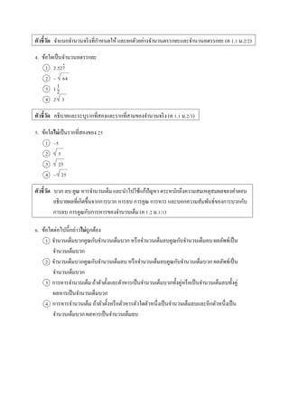 และทศนิยม บอกควำมสัมพันธ์ของกำรยกกำลังกับกำรหำรำกของจำนวนจริง (ค 1.2 ม.2/2) 11. + มีค่ำเท่ำกับข้อใด (ตอบเป็นทศนิยม 1 ตำแหน่ง) 1 0.2 2 0.4 3 0.7 4 1.1 ตัวชี้วัด หำค่ำประมำณของรำกที่สองและรำกที่สำมของจำนวนจริง และนำไปใช้ในกำรแก้ปัญหำ พร้อมทั้งตระหนักถึงควำมสมเหตุสมผลของคำตอบ (ค 1.3 ม.2/1) 12. 18 + 54 + 12 มีค่ำประมำณตรงกับข้อใด เมื่อกำหนดให้ 2 1.414, 3 1.732, 2 1.260 และ 3 1.442 1 4.406 2 4.588 3 11.486 4 12.032 ตัวชี้วัด บอกควำมเกี่ยวข้องของจำนวนจริง จำนวนตรรกยะ และจำนวนอตรรกยะ (ค 1.4 ม.2/1) 13.ข้อใดกล่ำวถูกต้องเกี่ยวกับจำนวนจริง 1 ทศนิยมซ้ำเป็นจำนวนอตรรกยะ 2 สำมำรถเขียนให้อยู่ในรูปเศษส่วนได้คือ ดังนั้น เป็นจำนวนตรรกยะ 3 จำนวนเต็มทุกจำนวนเป็นจำนวนตรรกยะ 4 รำกที่สองของจำนวนเต็มบวกทุกจำนวนเป็นจำนวนอตรรกยะ ตัวชี้วัด ใช้กำรคำดคะเนเกี่ยวกับกำรวัดในสถำนกำรณ์ต่ำง ๆ ได้อย่ำงเหมำะสม (ค 2.1 ม.2/3) 14.วำรีมีนัดสัมภำษณ์งำนที่บริษัทแห่งหนึ่งเวลำ 10.30 น. โดยวำรีใช้เวลำในกำรแต่งตัวและเตรียมเอกสำร 35 นำที เดินเท้ำจำกบ้ำนมำขึ้นรถตู้15 นำที ซึ่งรถตู้ใช้เวลำเดินทำง 80 นำที เพื่อมำถึงปำกทำงเข้ำบริษัท จำกนั้นวำรีเดินเท้ำต่อไปอีก 5 นำที จนถึงหน้ำบริษัท วำรีควรตื่นนอนก่อนเวลำใดเพื่อจะไปให้ทันนัด สัมภำษณ์งำน 1 8.00 น. 2 8.20 น. 3 8.40 น. 4 9.00 น. 3 3 1.3225 1,0003 0.008 0.000343 22 7 3 3 3