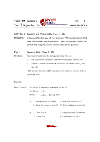 1. The document appears to be an English proficiency exam containing sections on speaking and writing ability.