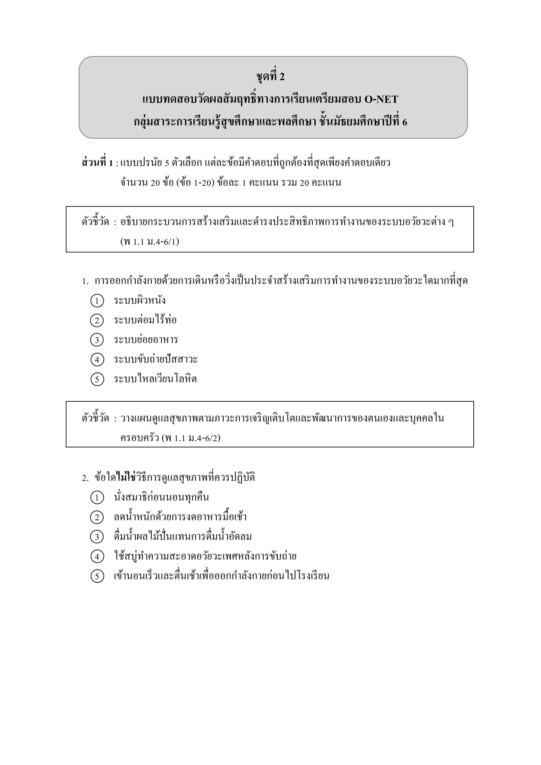 ชั้นมัธยมศึกษาปีที่ 6 ส่วนที่ 1 :แบบปรนัย 5 ตัวเลือก แต่ละข้อมีคำตอบที่ถูกต้องที่สุดเพียงคำตอบเดียว จำนวน 20 ข้อ (ข้อ 1-20) ข้อละ 1 คะแนน รวม 20 คะแนน ตัวชี้วัด : อธิบำยกระบวนกำรสร้ำงเสริมและดำรงประสิทธิภำพกำรทำงำนของระบบอวัยวะต่ำง ๆ (พ 1.1 ม.4-6/1) 1. กำรออกกำลังกำยด้วยกำรเดินหรือวิ่งเป็นประจำสร้ำงเสริมกำรทำงำนของระบบอวัยวะใดมำกที่สุด 1 ระบบผิวหนัง 2 ระบบต่อมไร้ท่อ 3 ระบบย่อยอำหำร 4 ระบบขับถ่ำยปัสสำวะ 5 ระบบไหลเวียนโลหิต ตัวชี้วัด : วำงแผนดูแลสุขภำพตำมภำวะกำรเจริญเติบโตและพัฒนำกำรของตนเองและบุคคลใน ครอบครัว (พ 1.1 ม.4-6/2) 2. ข้อใดไม่ใช่วิธีกำรดูแลสุขภำพที่ควรปฏิบัติ 1 นั่งสมำธิก่อนนอนทุกคืน 2 ลดน้ำหนักด้วยกำรงดอำหำรมื้อเช้ำ 3 ดื่มน้ำผลไม้ปั่นแทนกำรดื่มน้ำอัดลม 4 ใช้สบู่ทำควำมสะอำดอวัยวะเพศหลังกำรขับถ่ำย 5 เข้ำนอนเร็วและตื่นเช้ำเพื่อออกกำลังกำยก่อนไปโรงเรียน