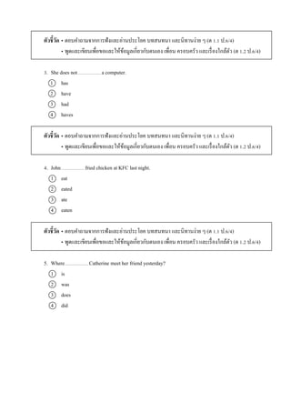 ตัวชี้วัด • ตอบคำถำมจำกกำรฟังและอ่ำนประโยค บทสนทนำ และนิทำนง่ำย ๆ (ต 1.1 ป.6/4)