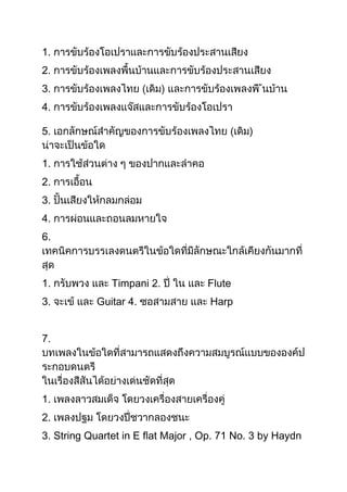 ข้อสอบ o-net ปี2551-2552<br />ข้อสอบ O-NET ดนตรี-นาฏศิลป์ ปีการศึกษา 2550 สอบเมื่อ 1 มี.ค. 2551<br />1. เครื่องดนตรีในข้อใดที่จัดอยู่ในประเภทเดียวกัน1. Clarinet , Tuba , French Horn 2. Piccolo , Trombone , Trumpet3. Oboe , Flute , Saxophone 4. Violin , Cello , Bassoon2. ปัจจุบันการผสมวงมโหรี มีเครื่องดนตรีในข้อใดที่แสดงให้เห็นว่าวงดนตรีดังกล่าวเป็นวงมโหรี1. จะเข้ 2. ซอสามสาย3. กระจับปี่ 4. ขลุ่ยเพียงออ3. ถ้าสมโชคได้รับการไหว้วานให้ไปนำวงดนตรีมาบรรเลงในงานสวดพระอภิธรรม สมโชคควรนำวงดนตรีในข้อใดมาบรรเลง1. ปี่พาทย์มอญ หรือ ปี่พาทย์ดึกดำบรรพ์2. ปี่พาทย์ นางหงส์ หรือ ปี่พาทย์ชาตรี3. ปี่พาทย์มอญ หรือ ปี่พาทย์เสภาเครื่องใหญ่4. ปี่พาทย์ นางหงส์ หรือ ปี่พาทย์มอญ<br />4. การขับร้องในข้อใดที่ใช้เทคนิคในการขับร้องใกล้เคียงกันมากที่สุด1. การขับร้องโอเปราและการขับร้องประสานเสียง2. การขับร้องเพลงพื้นบ้านและการขับร้องประสานเสียง3. การขับร้องเพลงไทย (เดิม) และการขับร้องเพลงพื ้นบ้าน4. การขับร้องเพลงแจ๊สและการขับร้องโอเปรา<br />5. เอกลักษณ์สำคัญของการขับร้องเพลงไทย (เดิม) น่าจะเป็นข้อใด1. การใช้ส่วนต่าง ๆ ของปากและลำคอ2. การเอื้อน3. ปั้นเสียงให้กลมกล่อม4. การผ่อนและถอนลมหายใจ6. เทคนิคการบรรเลงดนตรีในข้อใดที่มีลักษณะใกล้เคียงกันมากที่สุด1. กรับพวง และ Timpani 2. ปี่ ใน และ Flute3. จะเข้ และ Guitar 4. ซอสามสาย และ Harp<br />7. บทเพลงในข้อใดที่สามารถแสดงถึงความสมบูรณ์แบบขององค์ประกอบดนตรีในเรื่องสีสันได้อย่างเด่นชัดที่สุด1. เพลงลาวสมเด็จ โดยวงเครื่องสายเครื่องคู่2. เพลงปฐม โดยวงปี่ชวากลองชนะ3. String Quartet in E flat Major , Op. 71 No. 3 by Haydn4. Symphony No. 9 in D minor , Op. 125 by Beethoven8. เครื่องดนตรีพื้นบ้านในข้อใดที่เป็นเครื่องดนตรีในภูมิภาคเดียวกันทั้งหมด1. ปี่ พิณ โปงลาง แคน และโหวด2. พิณ สะล้อ โหวด โปงลาง และซึง3. รำมะนา ฆ้องคู่ กลองโนรา และพิณ4. โทนชาตรี ปี่ ตะโพน และฆ้องวง<br />9. ก่อนการเล่นเครื่องสาย ผู้เล่นจะใช้วัสดุชนิดหนึ่งถูที่สาย วัสดุนั้นคืออะไรและมีวัตถุประสงค์เพื่ออะไร1. ยางรัก เพื่อทำให้สายไม่ขาดง่าย2. ยางสน เพื่อให้ฝืดและมีเสียงไพเราะขึ้น3. ยางรัก ให้ฝืดและมีเสียงไพเราะขึ้น4. ยางสน เพื่อทำให้สายไม่ขาดง่าย10. เสียงเพลงในข้อใดที่ชาวบ้านร้องเล่นกัน โดยมีลูกคู่ร้องรับช่วงหนึ่งว่า“เอ้า ฮ้า ไฮ้ เชี้ยบ เชี้ยบ เชี๊ยบ”1. เพลงโคราช 2. เพลงซอ3. เพลงเรือ 4. เพลงอีแซว<br />11. บทเพลงเดียวกัน แต่มีผู้นำไปขับร้องสองคน ความไพเราะของบทเพลงดังกล่าวแตกต่างกันด้วยเหตุผลสำคัญในข้อใด1. การใช้เทคนิคการขับร้องที่เหมาะสมกับยุคสมัยและประเภทของบทเพลงของผู้ขับร้องแต่ละคน2. การแสดงลีลาท่าทางประกอบการขับร้องที่แตกต่างกันของผู้ขับร้องแต่ละคน3. ก
