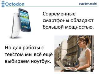 Документ представляет собой презентацию клавиатуры Октодон для мобильных устройств, которая обеспечивает высокую скорость ввода и эргономичный дизайн. В нем обсуждаются характеристики продукта, целевая аудитория и планы по финансированию и продаже лицензий. Также упоминается конкурентная среда и предполагаемые инвестиции в проект.