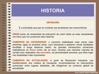 HISTORIA Prof. ISAACBUZO SÁNCHEZ ORIXE: naceu da necesidade da poboación de cubrir todas as súas necesidades con bens que non producían eles mesmos COMERCIO NA ANTIGÜIDADE: o comercio realizábase coas zonas máis próximas, agás os produtos caros, cuxo transporte e posterior venda resultaban rendibles a longa distancia (seda). As grandes transaccións comerciais realizábanse en feiras (unha vez ao ano), mentres que menores volumes de vendas eran realizados nos mercados , de periodicidade semanal, que tiñan lugar nas localidades máis importantes. COMERCIO NA ACTUALIDADE: A partir da Revolución Industrial, coa transformación dos medios de transporte, incrementáronse os intercambios comerciais entre lugares afastados, até chegarmos ao comercio global da actualidade DEFINICIÓN É a actividade que pon en contacto aos produtores cos consumidores