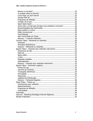 The document provides tips for achieving success on the internet, including developing a website, choosing an e-commerce model, and creating an action plan with tactics like optimizing the site and promoting it on social media. Various e-commerce models are described, like shopping, auctions, and marketplace platforms. Implementation details and challenges of online commerce are also addressed.