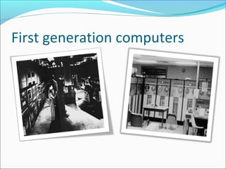 The document discusses the five generations of computers from the 1940s to present. The first generation used vacuum tubes, magnetic drums for memory, and machine language. The second generation introduced transistors, replacing vacuum tubes. High-level programming languages were also developed. The third generation saw the development of integrated circuits and interaction through keyboards and monitors. The fourth generation brought the microprocessor and single-chip computers. The fifth generation, still in development, focuses on artificial intelligence through parallel processing and technologies like voice recognition.