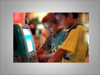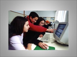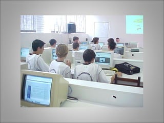 O documento discute como a internet pode melhorar a aprendizagem na escola, permitindo que os alunos explorem conhecimentos além do professor e desenvolvam pensamento crítico. Também ressalta que os professores devem se adaptar às novas tecnologias e usá-las em sala de aula, não apenas delegando atividades de computador a terceiros.