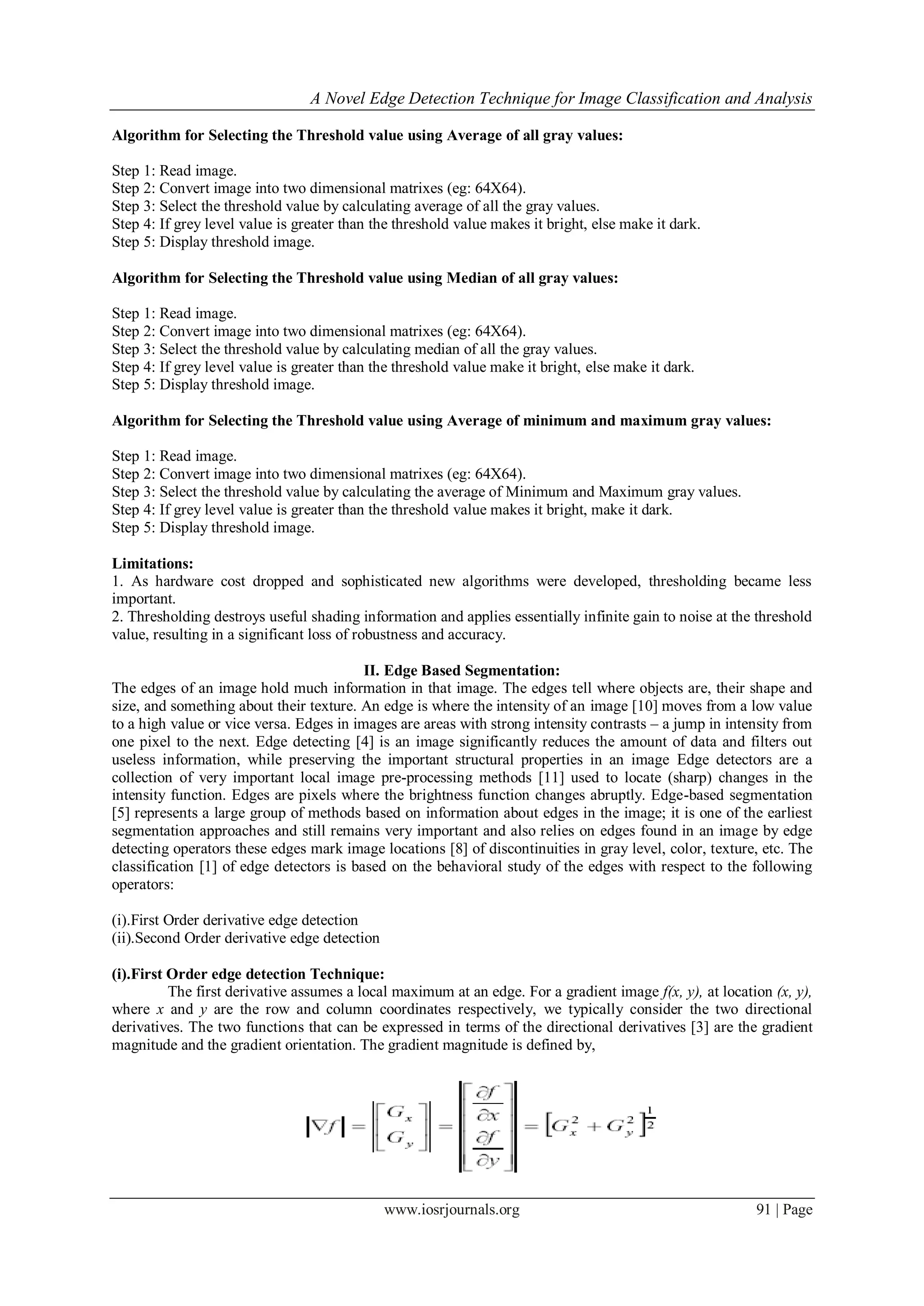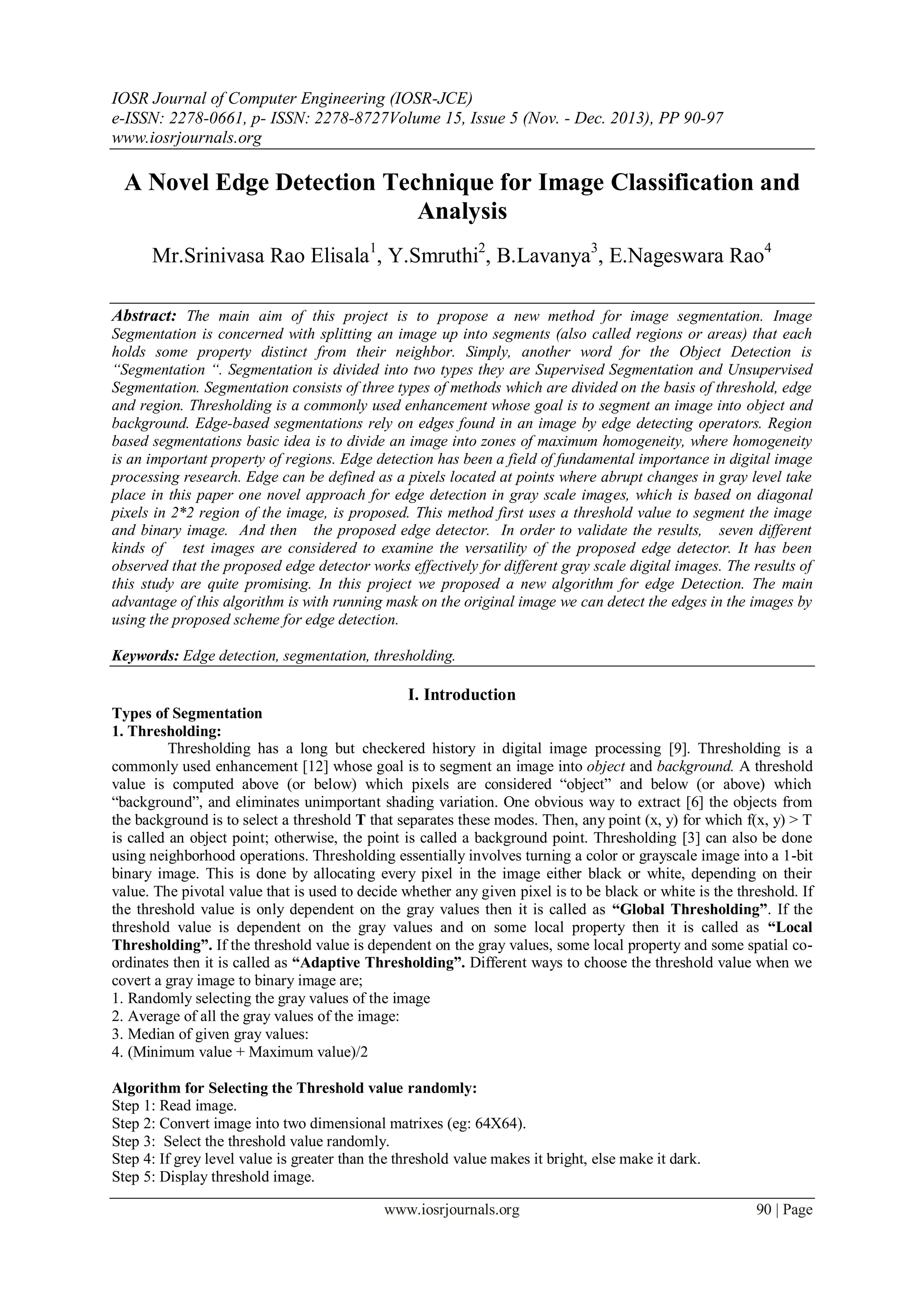 This paper presents a novel edge detection technique for image classification and analysis, focusing on image segmentation by dividing images into distinct regions using various methods like thresholding and edge-based segmentation. The proposed method utilizes diagonal pixels in a 2x2 area for effective edge detection in grayscale images, demonstrating promising results across multiple test images. The study explores different approaches to threshold selection and highlights the importance and challenges of edge detection in digital image processing.