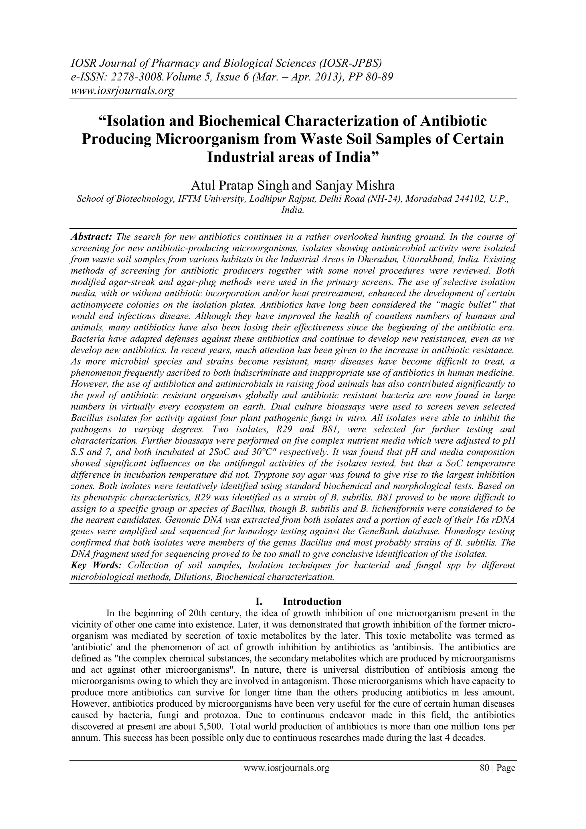 This document summarizes research that isolated and characterized antibiotic-producing microorganisms from waste soil samples collected from various industrial areas in India. Soil samples were collected and microbes were isolated using serial dilution and spread plating techniques. Isolates were screened for antibiotic production against other microbes using agar streak and plug methods. Two Bacillus isolates (R29 and B81) showed strong antifungal activity and were selected for further characterization. Biochemical and genetic tests identified R29 as Bacillus subtilis and B81 as likely Bacillus subtilis or Bacillus licheniformis. The research aims to discover new antibiotics and contributes to understanding antibiotic-producing microbes isolated from industrial waste soils.