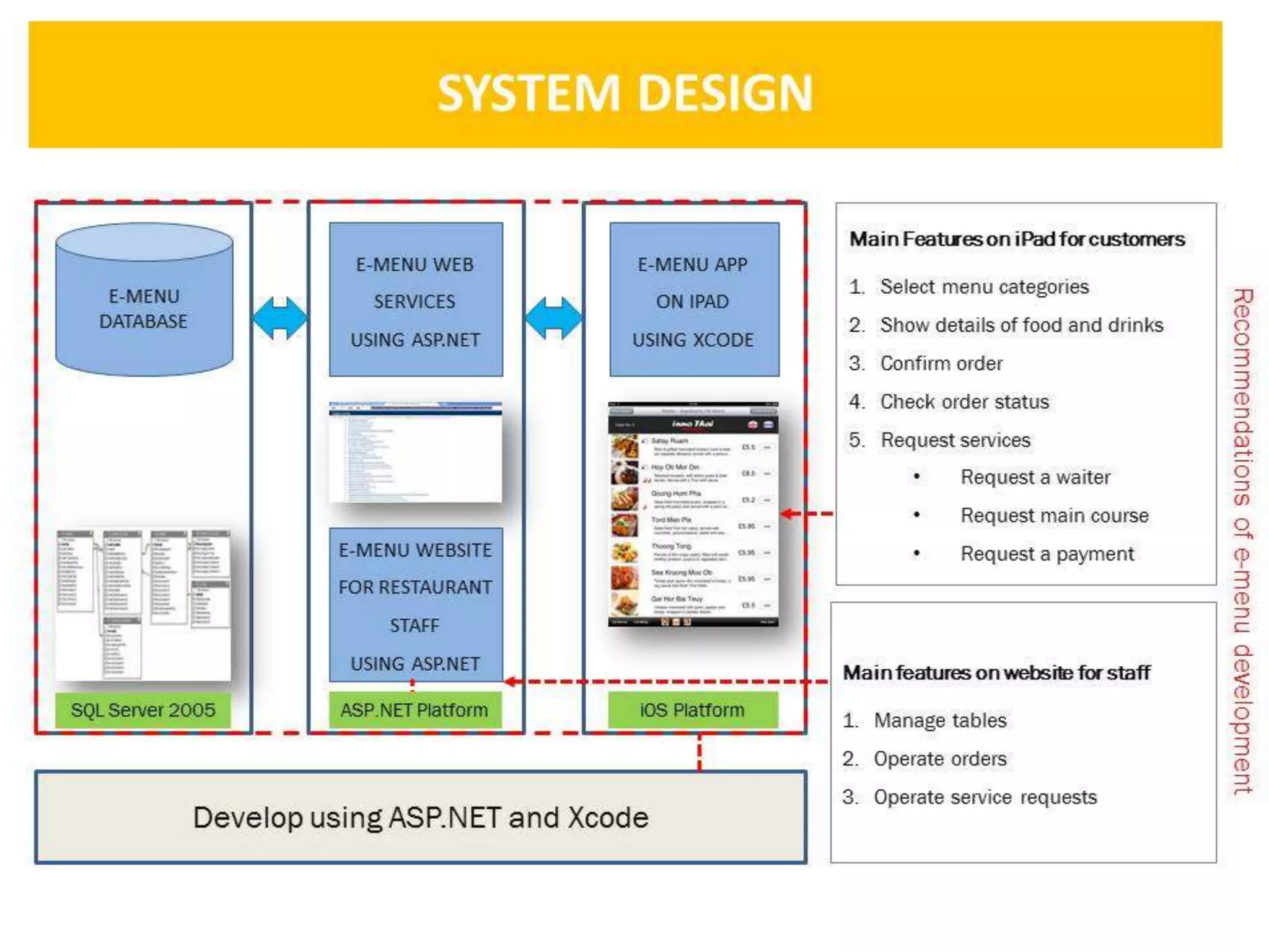 This document outlines a research project to develop a prototype electronic menu (e-menu) application for casual dining restaurants. The objectives are to analyze business requirements, design system documents and an e-menu prototype, and gather user perceptions of the prototype. The research framework involves key issues analysis, design documents, a software development process using RAD and prototyping, and direct observation. The outcomes will include recommendations for e-menu application development.
