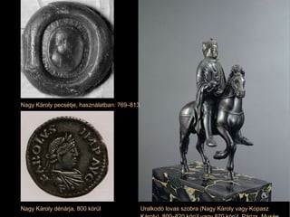 Nagy Károly pecsétje,használatban: 769–813 Nagy Károly dénárja, 800 körül Uralkodó lovas szobra (Nagy Károly vagy Kopasz Károly), 800–820 körül vagy 870 körül. Párizs, Musée du Louvre
