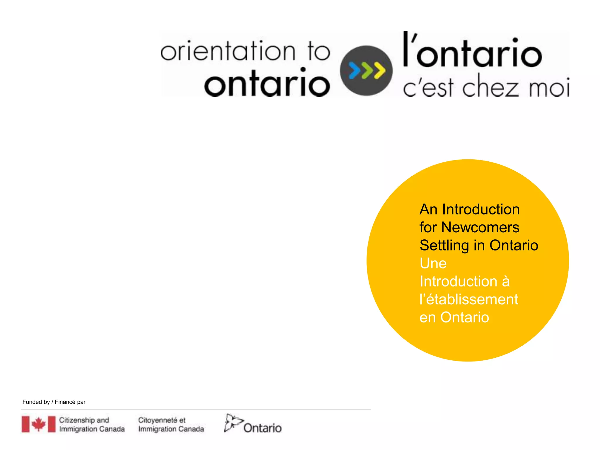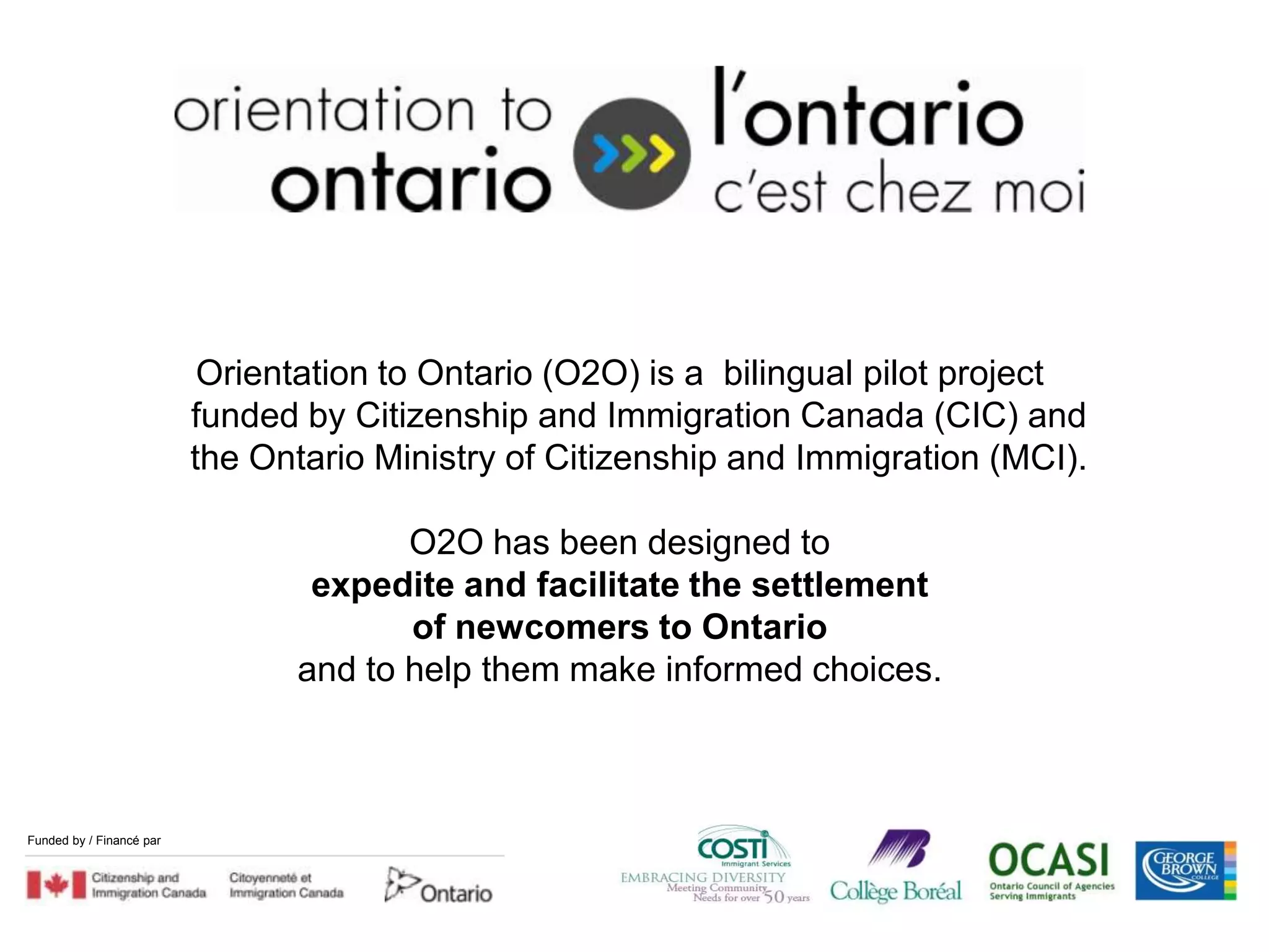 The document describes Ontario's Orientation to Ontario (O2O) pilot project. O2O provides settlement services to newcomers in Ontario through workshops, workbooks, and a website. The project aims to standardize orientation tools, expedite settlement, and help newcomers make informed choices. It will be delivered through agencies across Ontario and evaluated to assess effectiveness and feasibility of broader implementation.