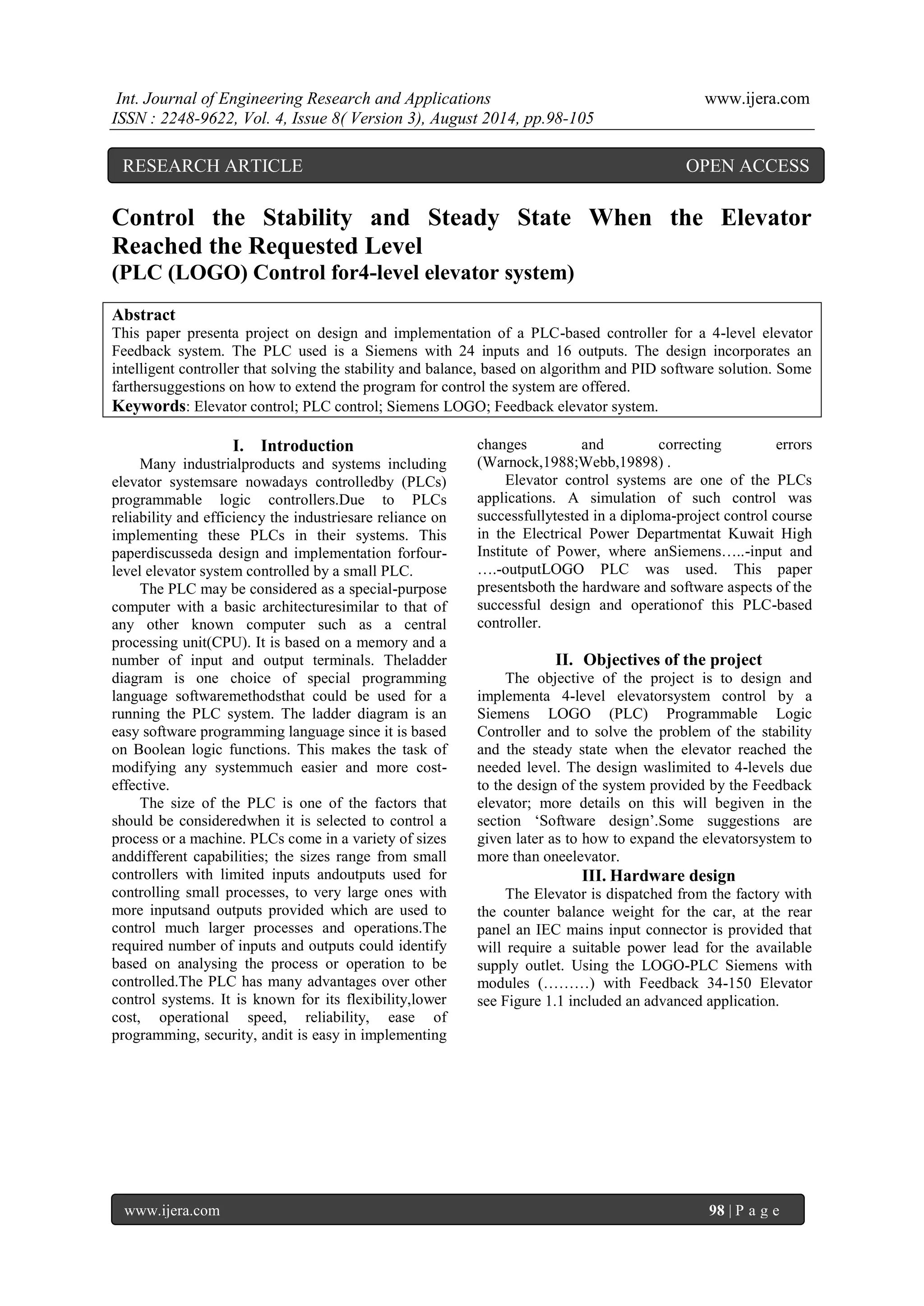 This paper discusses the design and implementation of a PLC-based controller for a 4-level elevator system using a Siemens PLC, focusing on stability and steady state management. The project details both hardware and software aspects, including the use of ladder diagrams for programming and suggestions for expanding the elevator control system. The successful implementation demonstrates the effectiveness of using PLC technology in industrial control systems.