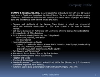 Ocampo & Associates is an architectural firm with over 33 years of experience in Florida and throughout the US. They are a multi-disciplinary company specializing in architecture, urban planning, and interiors. Some of their notable projects include the Weston Town Center mixed-use development, various municipal projects for cities like Weston and Riviera Beach, and residential, commercial, and healthcare buildings. They have experience across various project types and sectors.