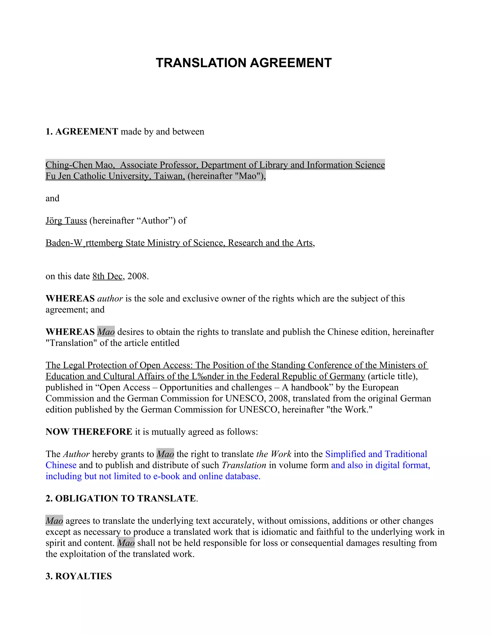 This document is a translation agreement between Ching-Chen Mao, an associate professor at Fu Jen Catholic University in Taiwan, and Jörg Tauss of the Baden-Württemberg State Ministry of Science, Research and the Arts in Germany. It grants Mao the right to translate Tauss' article "The Legal Protection of Open Access: The Position of the Standing Conference of the Ministers of Education and Cultural Affairs of the Länder in the Federal Republic of Germany" into simplified and traditional Chinese and to publish and distribute the translation in print and digital formats, including e-books and online databases. The translation will be done pro bono to promote open access in Chinese scholarly communities. All copyrights remain with