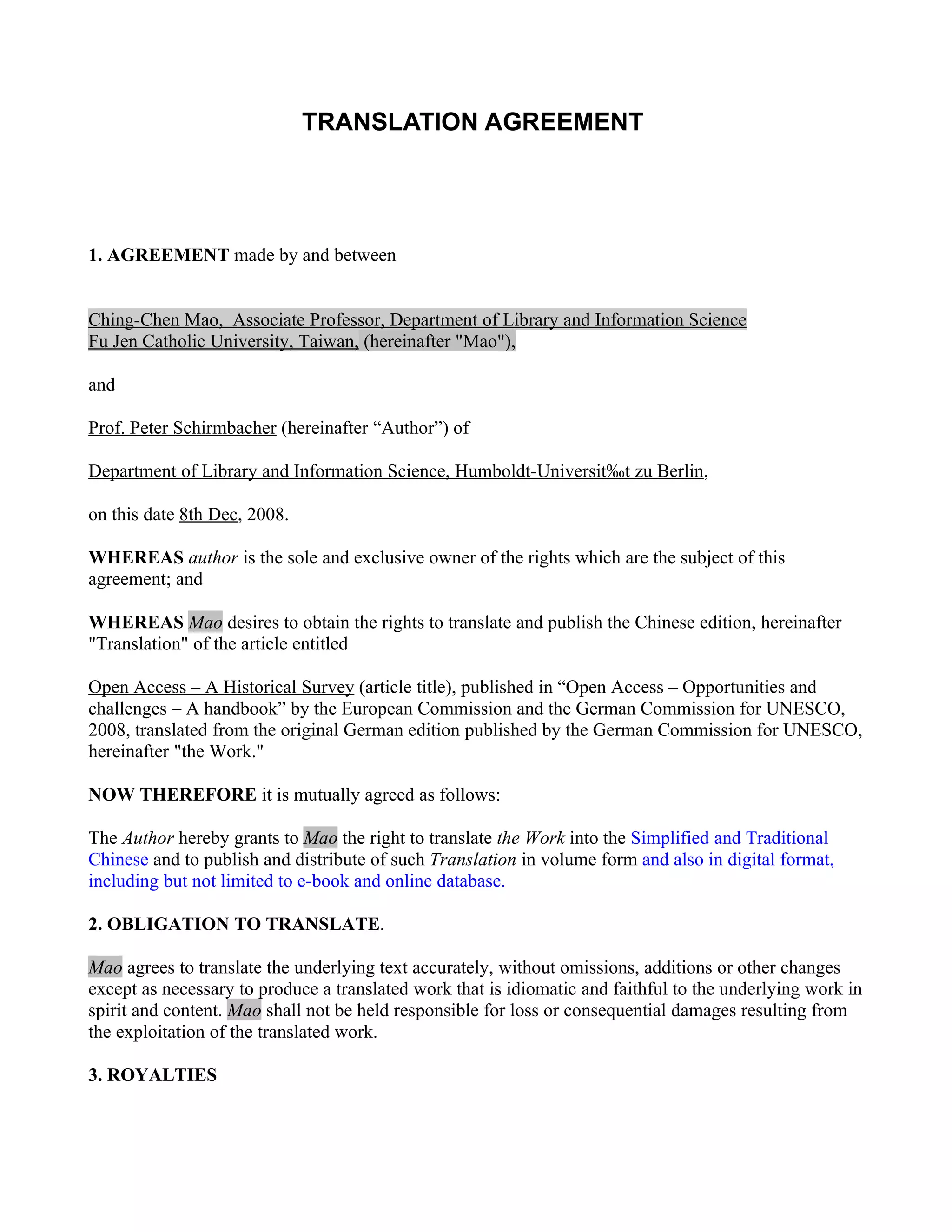 This document is a translation agreement between Ching-Chen Mao, an associate professor at Fu Jen Catholic University in Taiwan, and Prof. Peter Schirmbacher of Humboldt-Universität zu Berlin. The agreement grants Mao the right to translate Prof. Schirmbacher's article "Open Access – A Historical Survey" into simplified and traditional Chinese and to publish and distribute the translation in print and digital formats. Mao agrees to accurately translate the work without changes to the content or meaning. No royalties will be paid as the translation is being done to promote open access ideals. All copyrights remain with the original author.