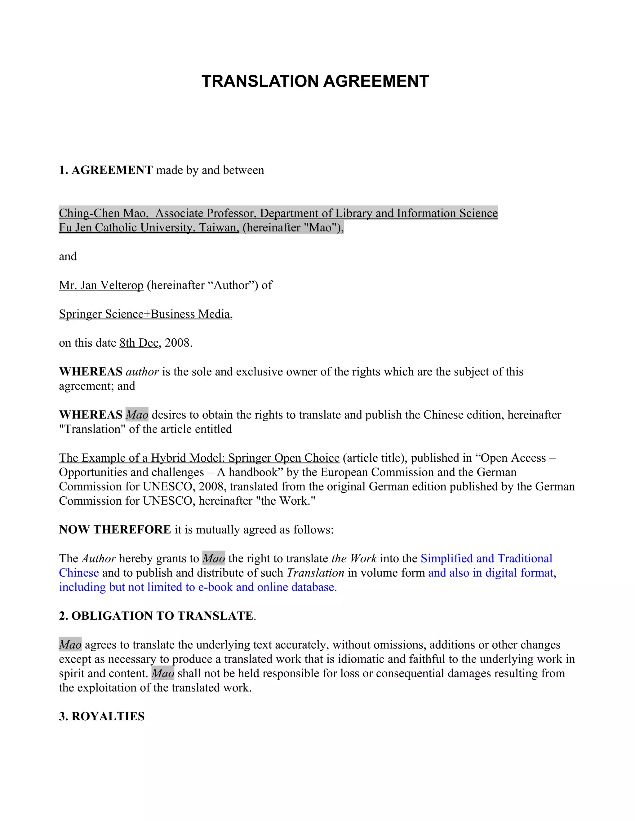 This document is a translation agreement between Ching-Chen Mao, an associate professor, and Jan Velterop, the author of an article. It grants Mao the right to translate Velterop's article "The Example of a Hybrid Model: Springer Open Choice" into simplified and traditional Chinese and publish the translation in print and digital formats without payment of royalties, as the translation is being done to promote open access ideals. Mao agrees to accurately translate the work without changes to content or meaning. All copyrights remain with the original author. The agreement is governed by Taiwan copyright law harmonized with the EU Copyright Directive.