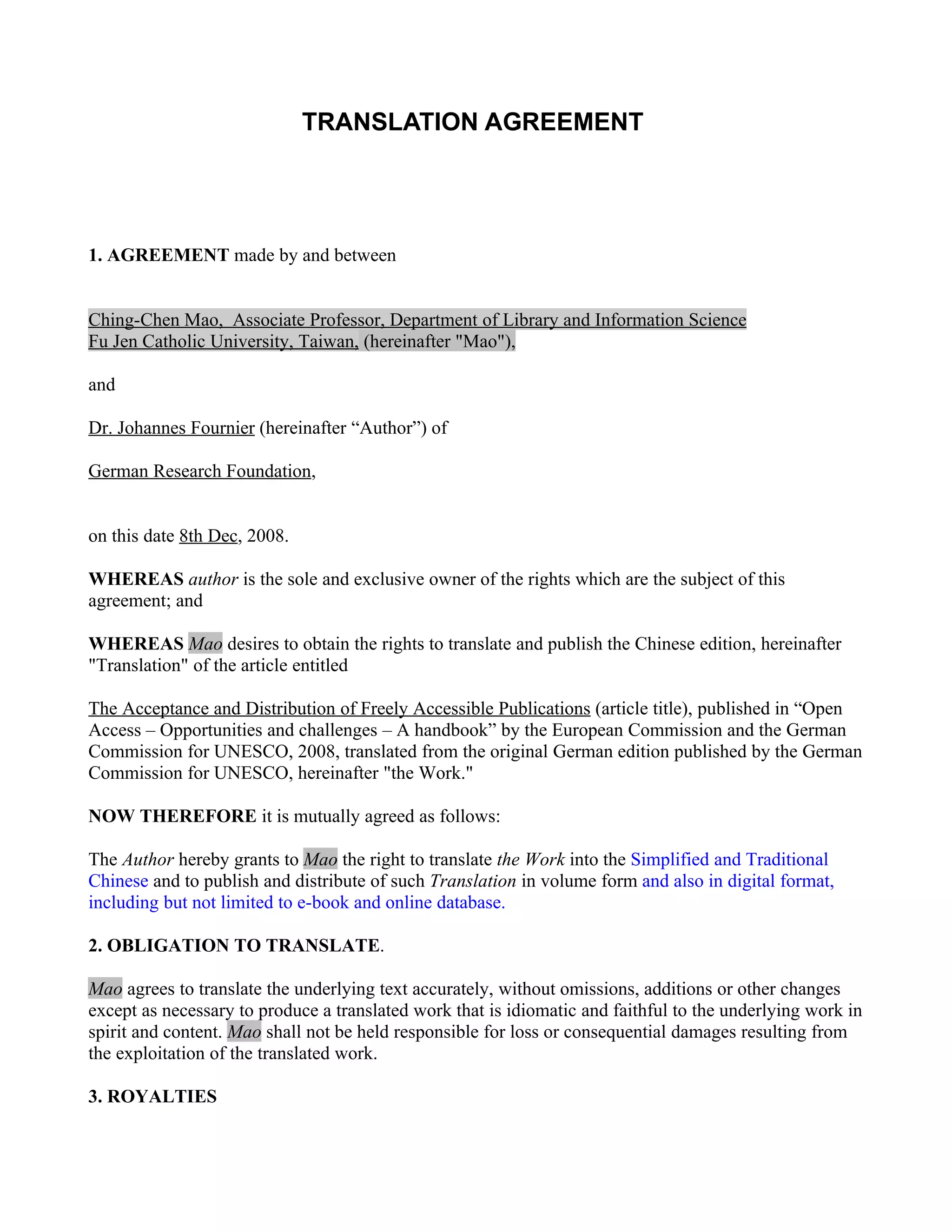 This document is a translation agreement between Dr. Johannes Fournier of the German Research Foundation and Ching-Chen Mao of Fu Jen Catholic University in Taiwan. It grants Mao the right to translate an article by Fournier into simplified and traditional Chinese and publish the translation in print and digital formats, including e-books and online databases. Mao agrees to accurately translate the work without changes to the content and will not be liable for damages from publishing the translation. No royalties will be paid as the translation is being done to promote open access ideals in Chinese scholarly communities. Copyright of the original work remains with the author.