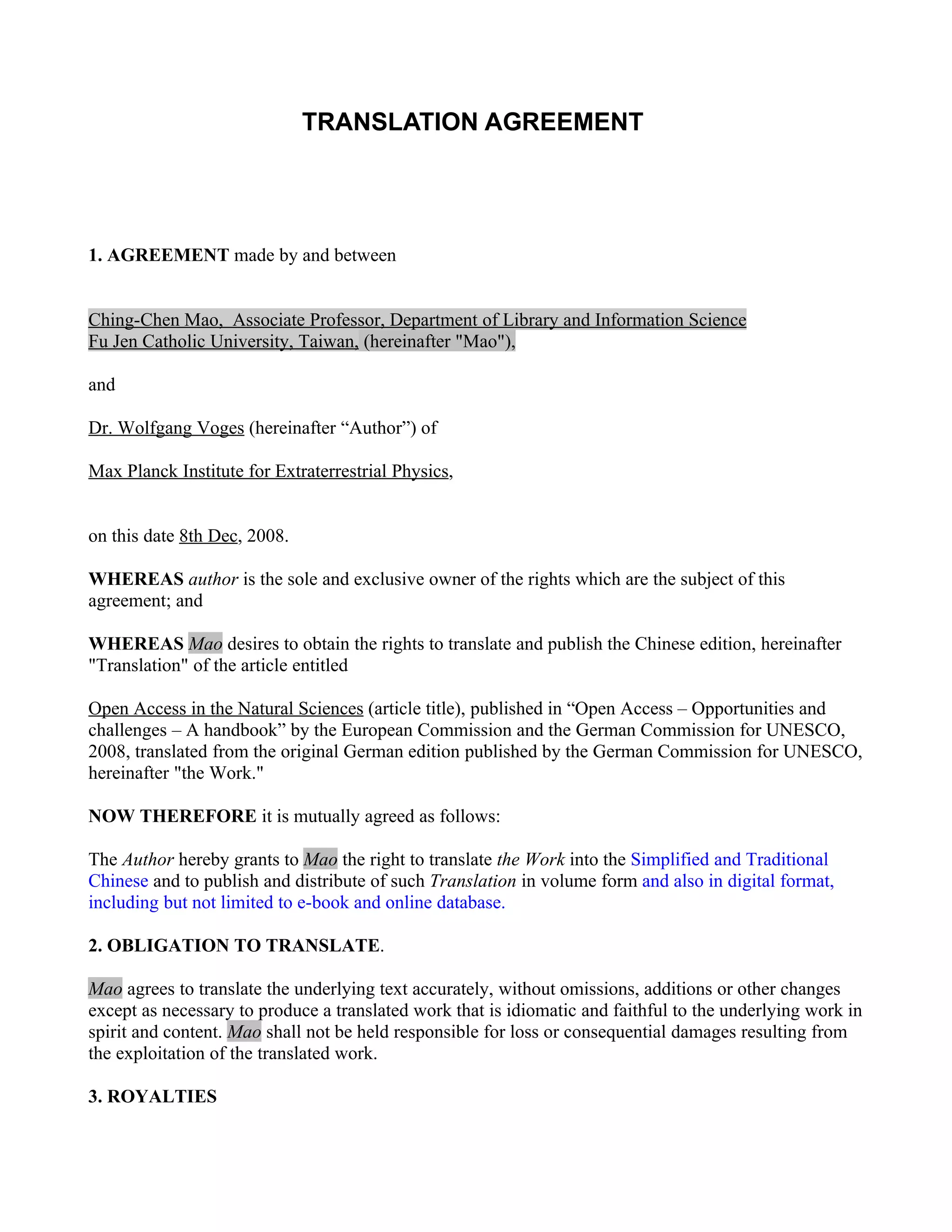 This document is a translation agreement between Dr. Wolfgang Voges, the author of an article, and Ching-Chen Mao, an associate professor, that grants Mao the right to translate the article into simplified and traditional Chinese. The agreement specifies that Mao will accurately translate the work without changes to content or meaning. It also states that there will be no royalties paid since the translation is being done to promote open access ideals in Chinese scholarly forums. The author retains full copyright over the original work.