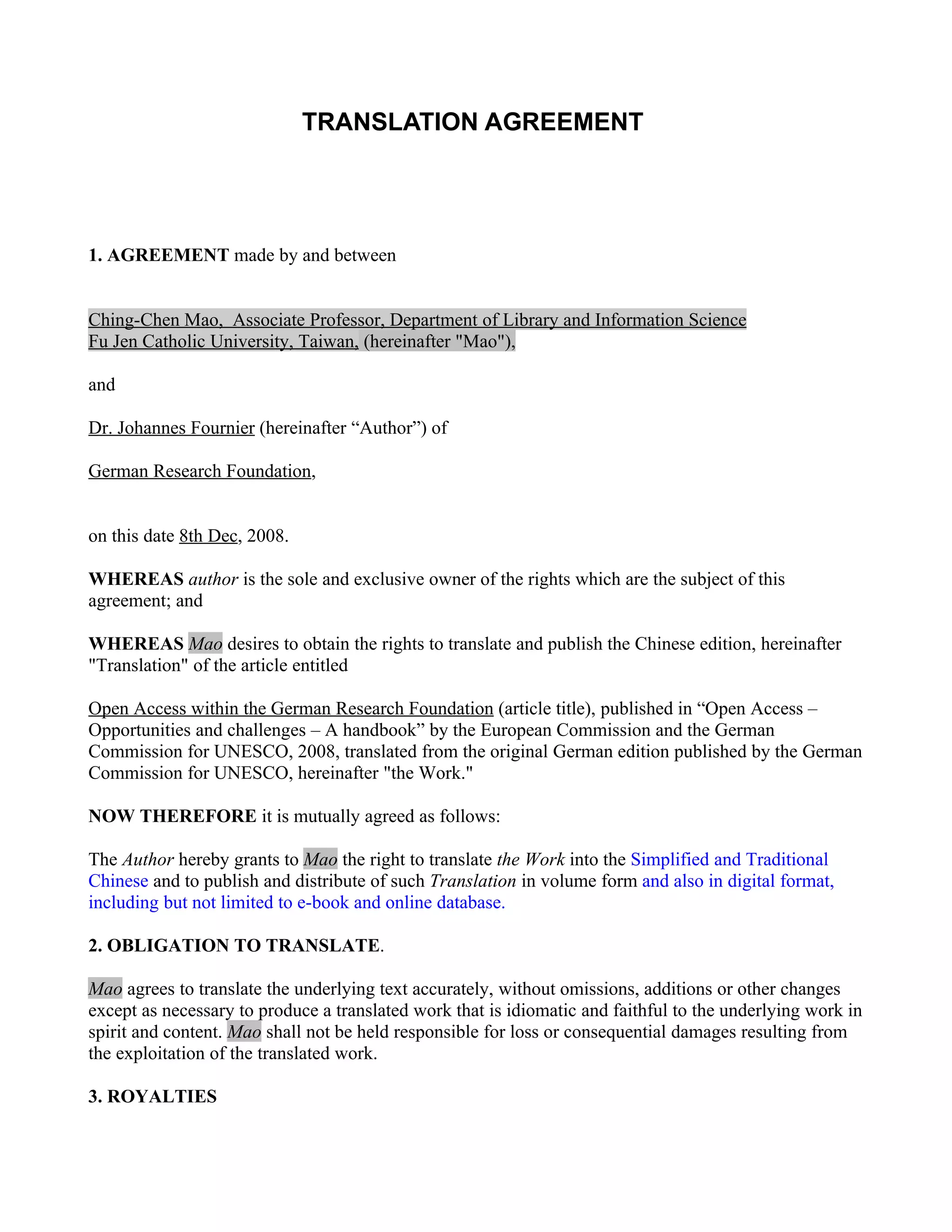 This document outlines a translation agreement between Dr. Johannes Fournier, the author and owner of the rights to the article "Open Access within the German Research Foundation", and Ching-Chen Mao, an associate professor who desires to translate the article into simplified and traditional Chinese. The agreement grants Mao the right to translate and publish the Chinese edition of the article in print and digital formats. Mao agrees to accurately translate the work without changes to content or meaning. No royalties will be paid as the translation is done on a pro bono basis to promote open access ideals by making the work available to Chinese readers. Copyright of the original work remains with the author.