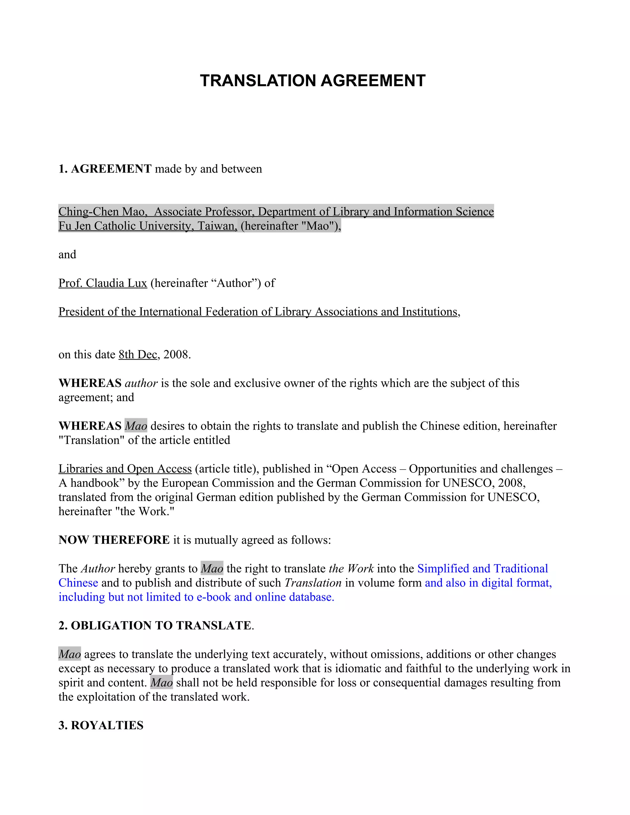 This document is a translation agreement between Ching-Chen Mao, an associate professor, and Prof. Claudia Lux, president of the International Federation of Library Associations and Institutions. The agreement grants Mao the right to translate Prof. Lux's article "Libraries and Open Access" into simplified and traditional Chinese and to publish and distribute the translation in print and digital formats. Mao agrees to accurately translate the work without changes, and there will be no royalties since the translation is being done to promote open access ideals. All copyrights remain with Prof. Lux, and the agreement is governed by Taiwan copyright law.