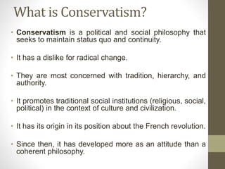 Michael Oakeshott was a 20th century British philosopher who made important contributions to conservative political thought. He criticized rationalism in politics and argued that political institutions evolve organically based on tradition and experience rather than abstract rational principles. Oakeshott believed politics should focus on practical knowledge rather than technical rules, and that the role of the state is to govern pragmatically and maintain stability rather than pursue ideological goals. He advocated for a minimalist state and pluralistic political order based on civil associations respecting tradition over rational designs for society.