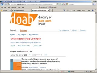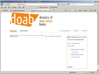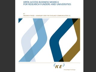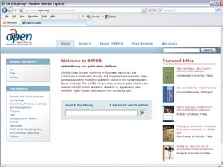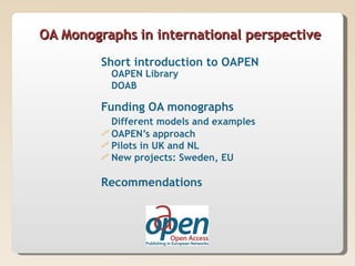 OAPEN provides a platform for open access monographs and is exploring funding models for open access publishing. OAPEN's approach uses a hybrid model where the basic online edition is freely available open access while other editions can be sold. OAPEN is running pilots in the UK and Netherlands to test this model and measure the effect of open access on usage and sales. New projects are exploring open access monograph publishing in Sweden and across Europe through shared infrastructure between universities. Recommendations include using existing funds for publishing open access monographs and ensuring quality assurance through peer review.