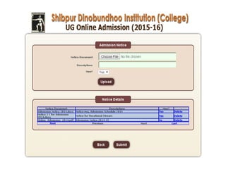 The document describes an online admission form submission system that features minimum typing effort to fill forms with strong validation, morning/day/evening college-specific sections, different eligibility criteria for general and reserved categories, predefined course combinations, merit-based admission approval after counseling, waiting list status checks, optional SMS/email alerts, form validation/rejection tags, and dynamic ranked, admitted and downloadable lists by course and category. It is hosted on redundant/VPS/dedicated servers and offers free demonstrations.