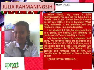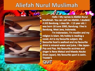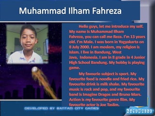 Sukmawan Chandra introduces himself in 3 sentences. He is a 14-year-old male student in the 8th grade of Junior High School 4 in Bandung, Indonesia. His hobbies include playing futsal and basketball. He thanks Allah, Google, his school, a game house, his English teacher, his classmates, other teachers and friends at the end of the document.