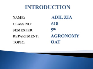 This document provides information about oats grown by student Adil Zia for their 5th semester agronomy project. It discusses the introduction of oats, their use as food and feed, cultivation practices including sowing, fertilizer application and pest/disease management. Oats are planted in September-December in Pakistan and harvested 4-5 months later in April to avoid grain shedding. Common varieties studied include DN-8 and Avena Fatua.