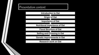Oat is an important fodder crop that originated in Asia. It has many nutritional benefits for both humans and animals. Research institutions in Pakistan have developed high yielding oat varieties that are resistant and adapted to local conditions. Oat shows potential as a crop in Pakistan but is currently underutilized as a human food compared to wheat. More research is needed to develop new oat varieties and promote its uses.
