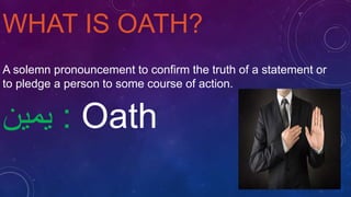 The document discusses the concepts of oaths and vows in Islamic context, explaining different types of oaths such as intended and unintended oaths and their respective consequences. It states that breaking an intended oath requires expiation, which can include feeding the needy, clothing them, freeing a slave, or fasting. Vows are also described as commitments to perform non-obligatory acts, with guidance provided from the teachings of the Prophet Muhammad regarding adherence to such vows.