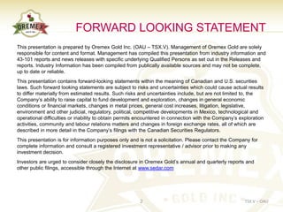 1) Oremex Gold Inc. is a Canadian gold exploration and development company focused on advancing its portfolio of 100% owned gold assets in Mexico.