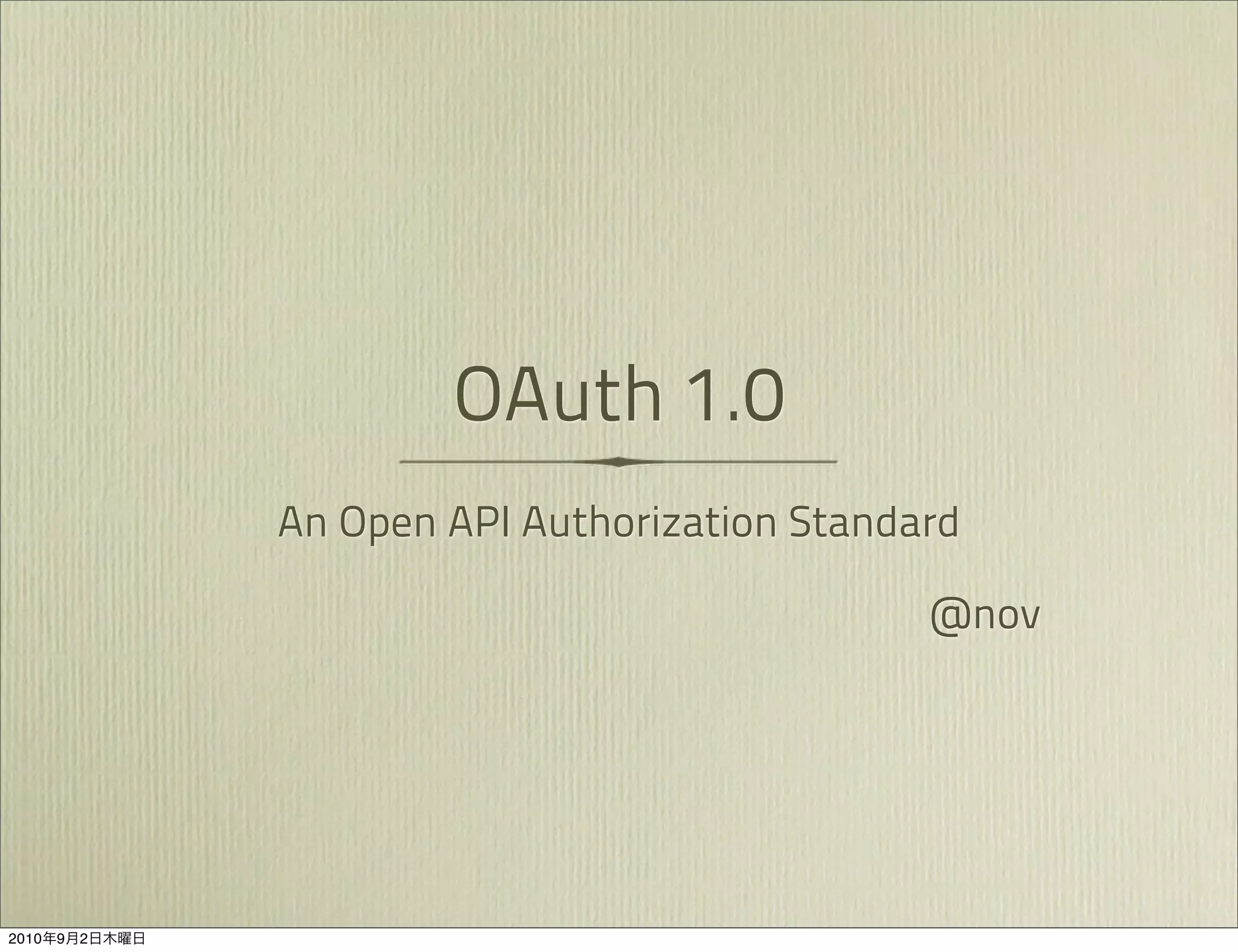 The document discusses OAuth 1.0, an open standard for authorization in API access. It describes the key components of OAuth 1.0 including the three roles of user, consumer, and service provider. It outlines the three step authorization process of obtaining a request token, user authorization, and exchanging for an access token. The document provides details on OAuth signatures and parameters used to securely authorize API access on behalf of the user.