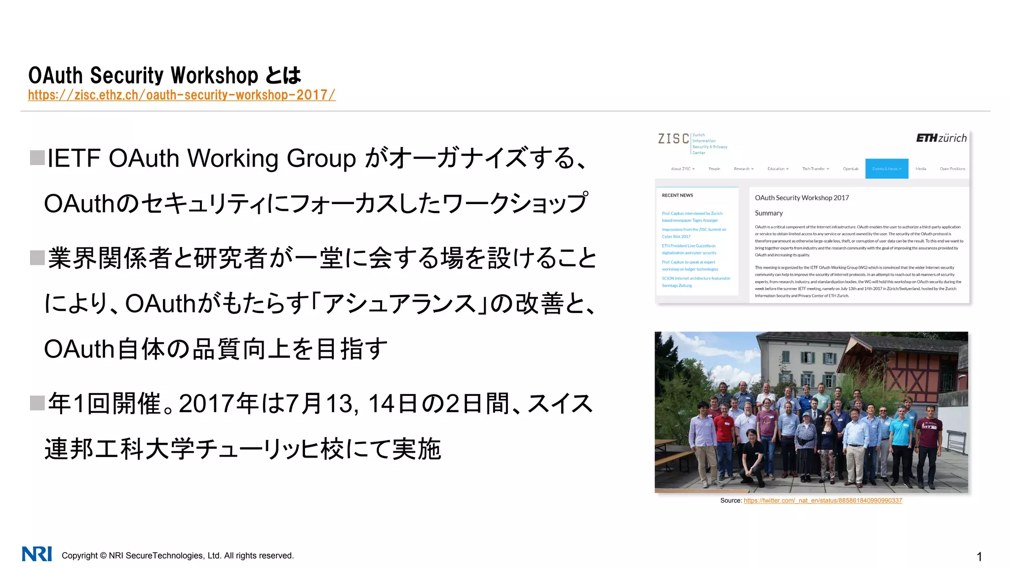 SecureTechnologies, Ltd. All rights reserved. 1 IETF OAuth Working Group がオーガナイズする、 OAuthのセキュリティにフォーカスしたワークショップ 業界関係者と研究者が一堂に会する場を設けること により、OAuthがもたらす「アシュアランス」の改善と、 OAuth自体の品質向上を目指す 年1回開催。2017年は7月13, 14日の2日間、スイス 連邦工科大学チューリッヒ校にて実施 OAuth Security Workshop とは https://zisc.ethz.ch/oauth-security-workshop-2017/ Source: https://twitter.com/_nat_en/status/885861840990990337