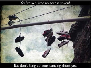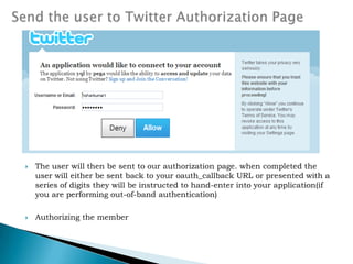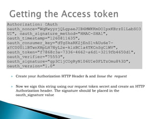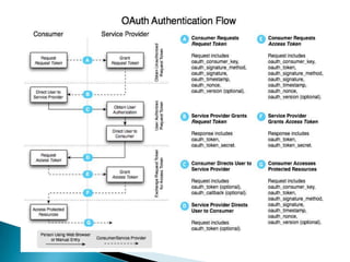 The document discusses the OAuth authorization protocol. It defines key terms like service provider, user, consumer, and protected resources. It describes the workflow of OAuth including obtaining a request token, redirecting the user to authorize access, and exchanging the request token for an access token. It also covers OAuth security features like digital signatures, hash algorithms, and use of nonces and timestamps to prevent replay attacks. The document provides an example of using OAuth to allow a photo printing service access to a user's private photos on a photo sharing site. It also discusses troubleshooting common OAuth issues.